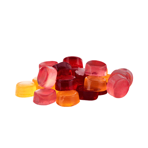 Maltitol syrup, Water, Gelatin, Modified coconut oil, Cannabis extract, Citric acid, Malic acid, Natural flavour, Annatto (colour), Anthocyanins (colour), Modified canola oil, Carnauba wax, Alpha-tocopherol. May contain: Milk, Soy, Sulphites.